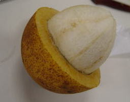 Árvore: de até 15 m de altura Fruto: com 3 cm de diâmetro, a casca é consistente e a polpa carnosa, branca, de sabor agridoce