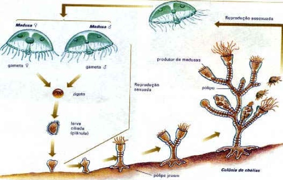 No filo cnidária existem basicamente dois tipos morfológicos de indivíduos: as medusas, que são natantes e os pólipos, que são sésseis. Eles podem formar colônias, como é o caso dos corais (colônias sésseis) e das caravelas (colônias flutuantes).