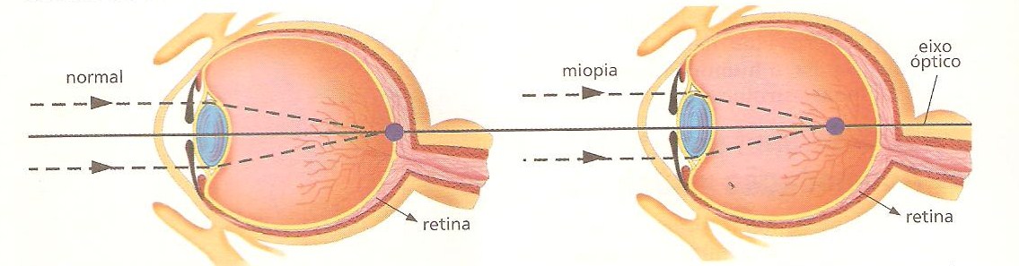 Explique que em alguns olhos, a córnea e o cristalino não focalizam corretamente. Nos olhos míopes, a luz de objetos distantes é focalizada antes da retina, por isso a imagem fica borrada. Nos olhos com presbiopia, ou “vista cansada”, a luz de objetos próximos é focalizada depois da retina, o que também os faz parecer borrados. Pessoas com miopia ou presbiopia podem usar óculos ou lente de contato para corrigir o foco do olho. Hipermetropia é o nome dado ao erro de focalização da imagem no olho, fazendo com que a imagem seja formada após a retina. Isso acontece principalmente porque o olho do hipermétrope é um pouco menor do que o normal. Outras causas incluem aquelas situações onde a córnea ou o cristalino geralmente tem alterações no seu formato. O Astigmatismo é uma deficiência visual, causada pelo formato irregular da córnea ou do cristalino formando uma imagem em vários focos que se encontram em eixos diferenciados. Uma córnea normal é redonda e lisa. Nos casos de astigmatismo, a curvatura da córnea é mais ovalada, como uma bola de futebol americano. Este desajuste faz com que a luz se refrate por vários pontos da retina em vez de se focar em apenas um. Para as pessoas que sofrem de astigmatismo, todos os objetos - tanto próximos como distantes - ficam distorcidos. As imagens ficam embaçadas porque alguns dos raios de luz são focalizados e outros não. A sensação é parecida com a distorção produzida por um pedaço de vidro ondulado. O astigmatismo é hereditário e pode ocorrer em conjunto com a miopia ou a hipermetropia.