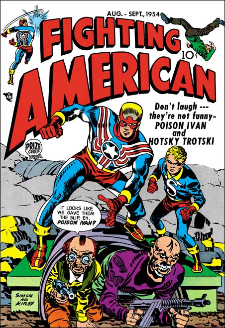 Edição de agosto de 1954 de Fighting American. A personagem criada por Simon e Jack Kirby (os mesmos criadores do Capitão América) apresentava um tom anticomunista, que pode ser verificado nos nomes russos de seus inimigos: “Poison Ivan” (algo como Ivan Venenoso) e Hotsky Trotski (alusão ao revolucionário comunista Leon Trotsy). Imagem disponível em http://3.bp.blogspot.com/-tV8kVTVGza8/TgjfewuJ5OI/AAAAAAAAADY/A4qOt2nkK84/s1600/%25C3%258Dndice.jpg