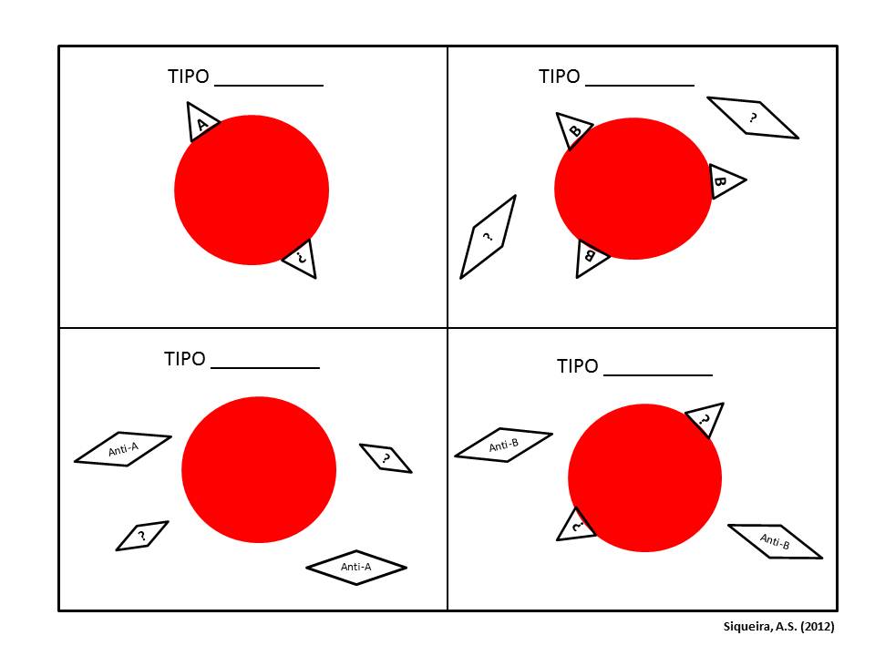 4º Momento: neste ponto da aula os alunos serão desafiados a descobrir quais aglutininas e aglutinogênios estão presentes nos diferentes tipos sanguíneos. Lance o desafio aos alunos fornecendo a seguinte dica: o tipo sanguíneo de uma pessoa é determinado pelo tipo de aglutinogênio presente em suas hemácias. Baseado nesta informação e na explicação anteriormente dada, cada grupo deverá colar nas hemácias de cada tipo sanguíneo os aglutinogênios correspondentes. O mesmo será adotado para o plasma de cada tipo sanguíneo. Ao final, cada grupo deverá ter montado o modelo presente em sua mesa, que deverá ficar semelhante ao apresentado abaixo.