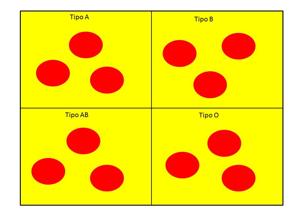 O professor deverá providenciar o material que será utilizado na aula. Se a atividade for realizada no laboratório o ideal é que, antes dos alunos se dirigirem para lá, o professor já tenha organizado o material. Em cada mesa ou bancada, o professor deverá afixar uma cartolina amarela dividida em quatro partes identificadas com os tipos sanguíneos, sendo que em cada parte deverão ser colados três círculos vermelho para representar as hemácias. Observe o modelo abaixo.