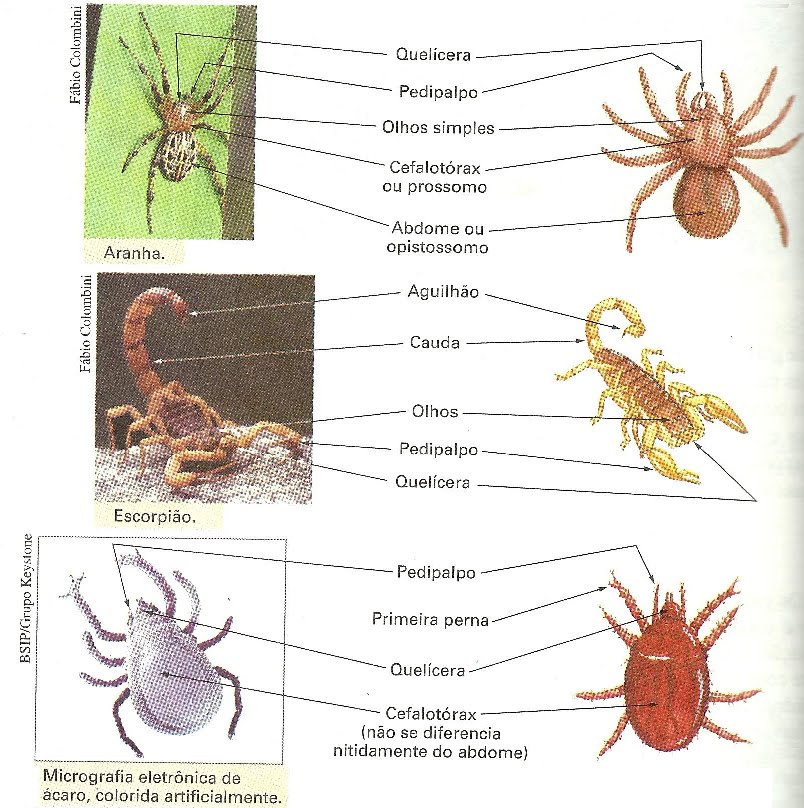 Obs.: O professor deve esclarecer que insetos e aracnídeos são animais diferentes, e isso é motivo de muita confusão, pois muitas pessoas acham que aranhas, escorpiões, carrapatos e outros são insetos, o que não é verdade. Desse modo, após o levantamento das hipóteses dos alunos, o professor apresentará aos alunos um quadro que destaca as diferenças entre os insetos e aracnídeos. Veja sugestão abaixo: