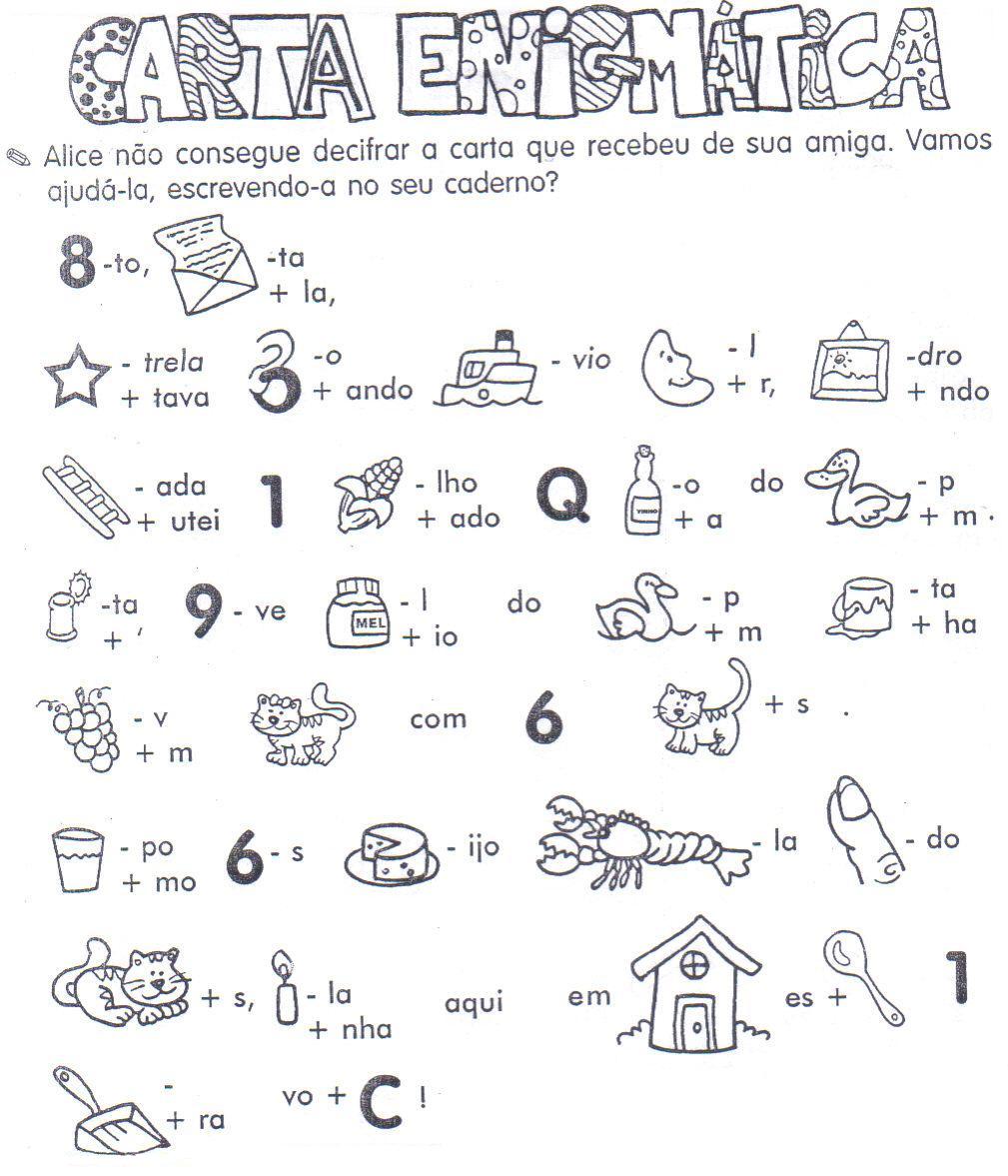 3º Momento: Ainda em trios oriente os alunos a construírem uma Carta Enigmática utilizando as palavras supracitadas que deverão ser remetidas a outro grupo para que a decifrem. Veja abaixo um exemplo de Carta Enigmática para mostrar aos alunos: