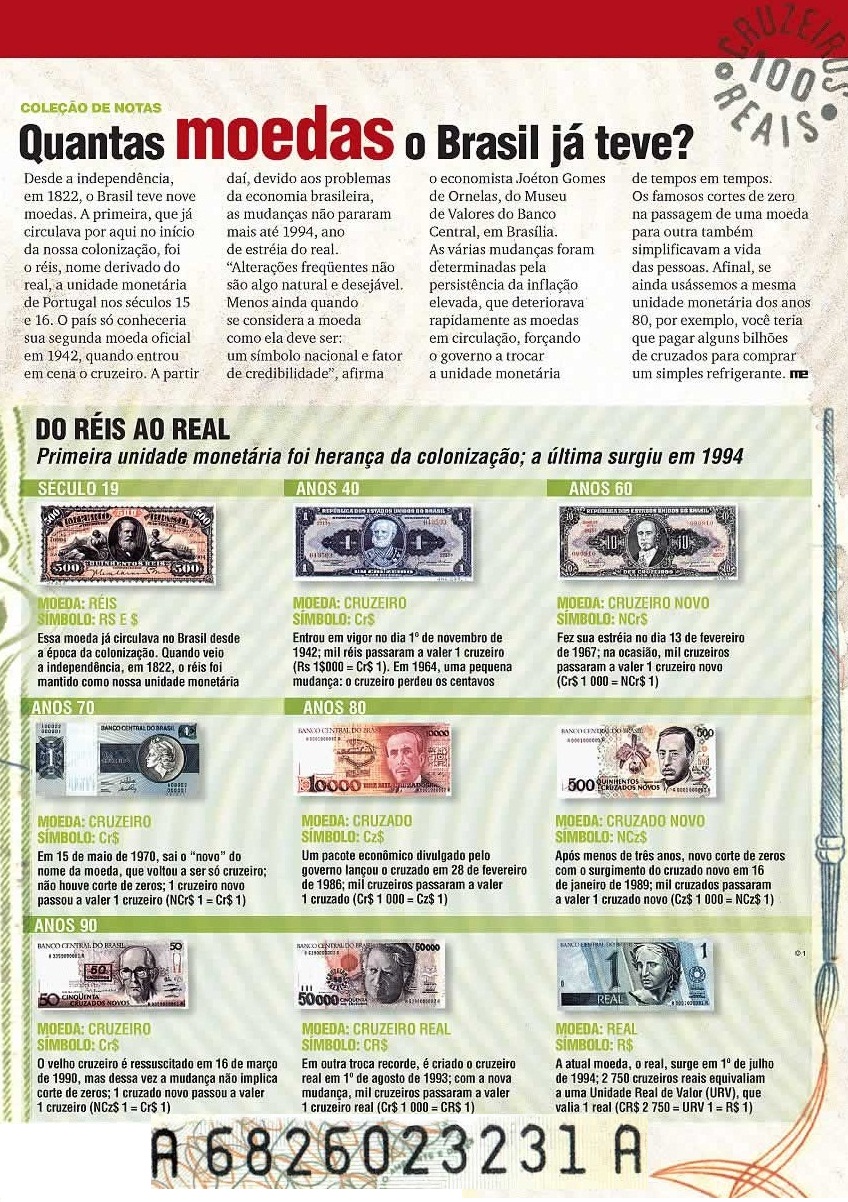 b. Em seguida, os alunos devem relacionar o conteúdo do material da revista com o áudio analisado anteriormente. Chame a atenção deles para a cronologia da história da moeda no Brasil, focalizada no recurso, bem como para a cédula representativa de cada moeda: réis (século XIX), cruzeiro (anos 40), cruzeiro novo (anos 60), cruzeiro (anos 70), cruzado (anos 80), cruzado novo (anos 80), cruzeiro (anos 90), cruzeiro real (anos 90), real (atual).