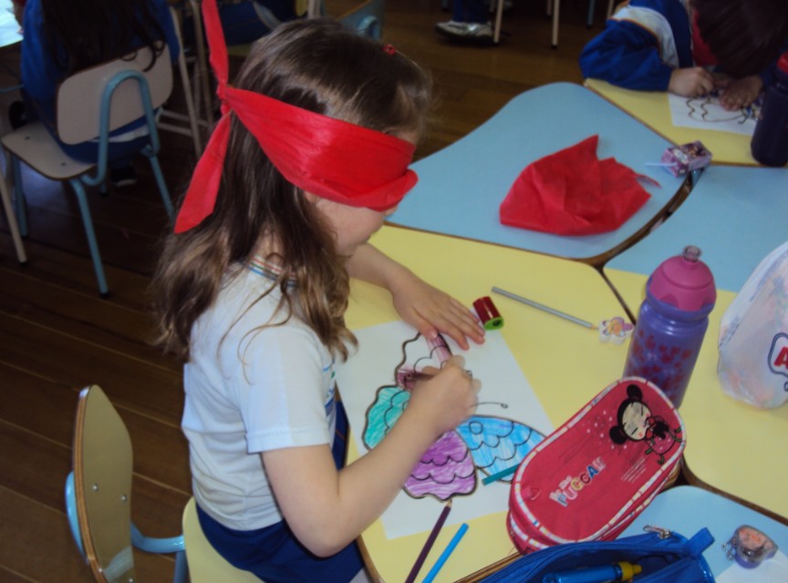 4. Finalizado o desenho, solicite que os alunos tirem as vendas e observem a atividade realizada com venda e sem venda. Proponha uma roda de discussão em que os alunos apresentem os desenhos e comentem o que acharam da atividade.