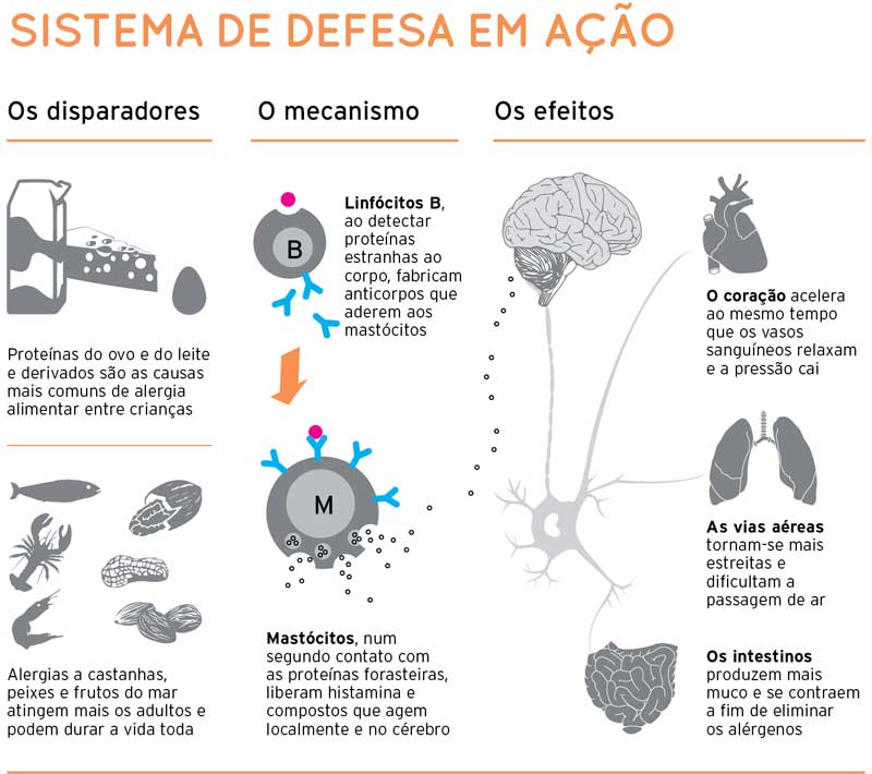 Cabe ao professor realizar o fechamento da discussão, chamando a atenção para aspectos centrais no conteúdo estudado e fazendo uma síntese do mesmo. Sugerimos que utilize a imagem abaixo, que resume o mecanismo orgânico do sistema de defesa atuando em casos de alergias, explorando o esquema didático.